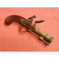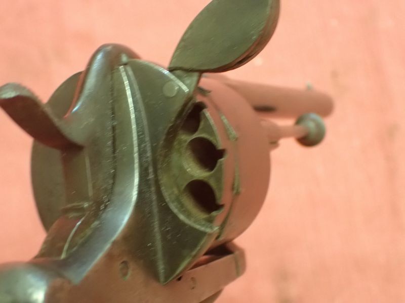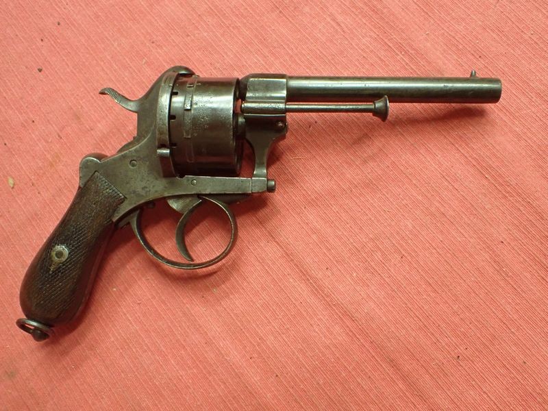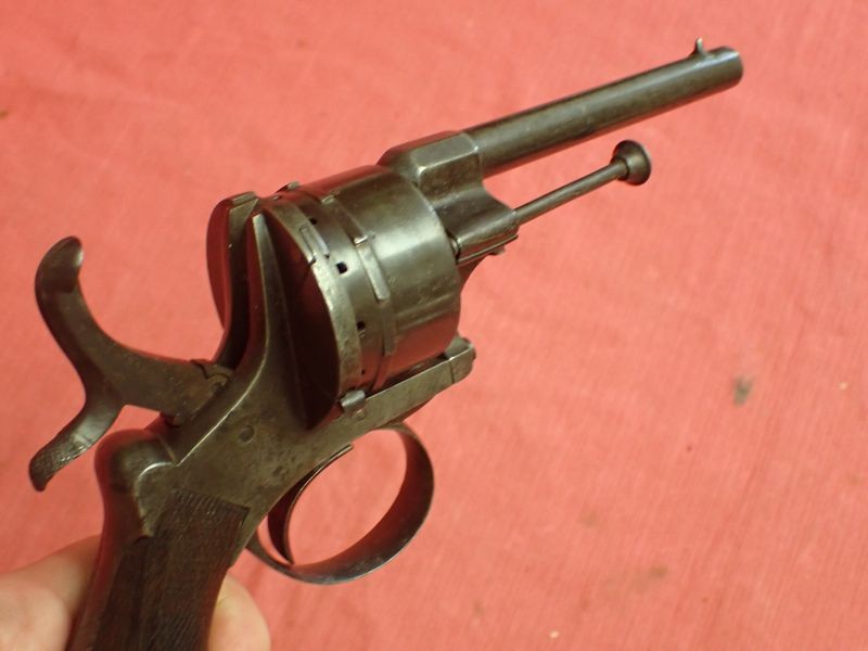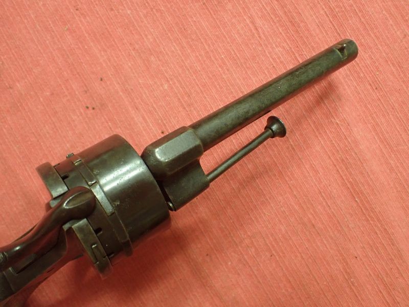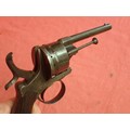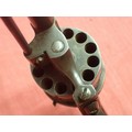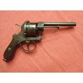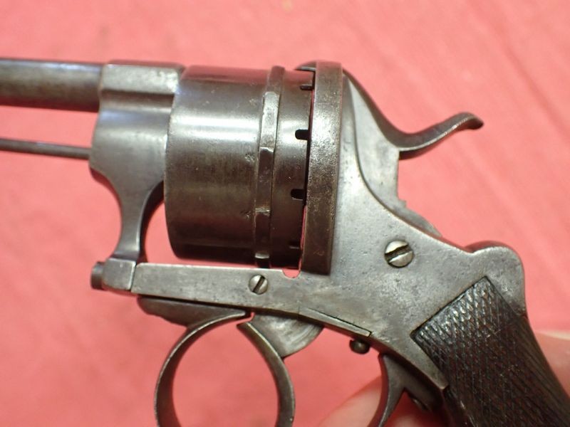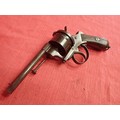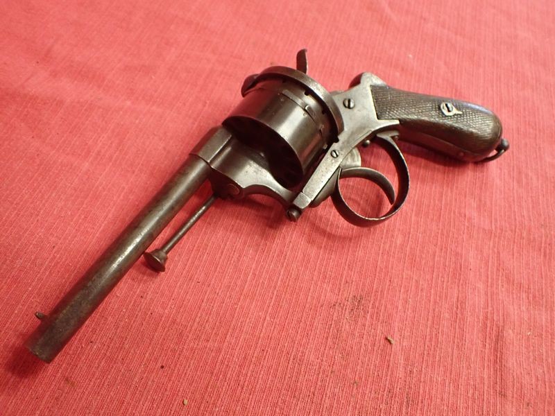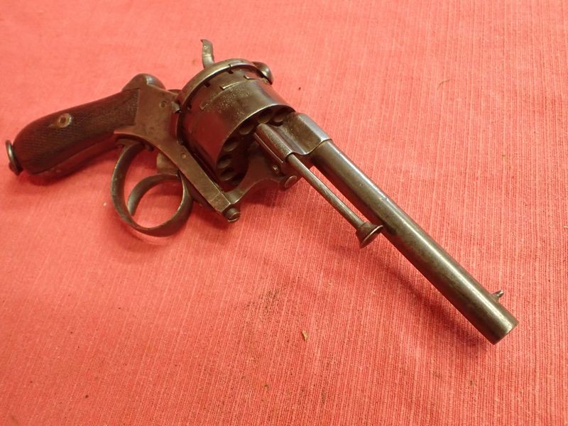 Rare 12 shot revolver of 7 mm calibre. Imported for the British market, with Birmingham proof marks to each chamber. Double action in good working order. Untouched dark grey patina overall. 4.5 inch barrel. Checkered grips with lanyard ring to the base.