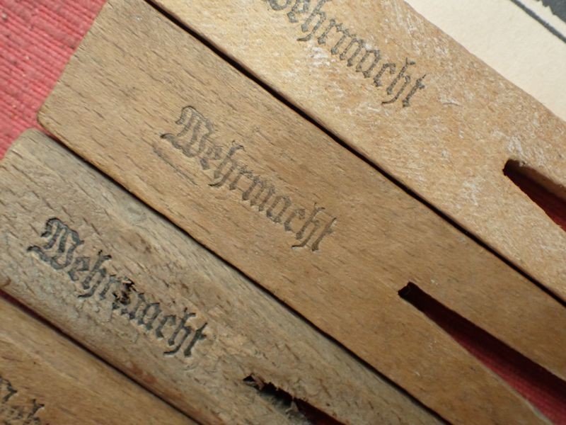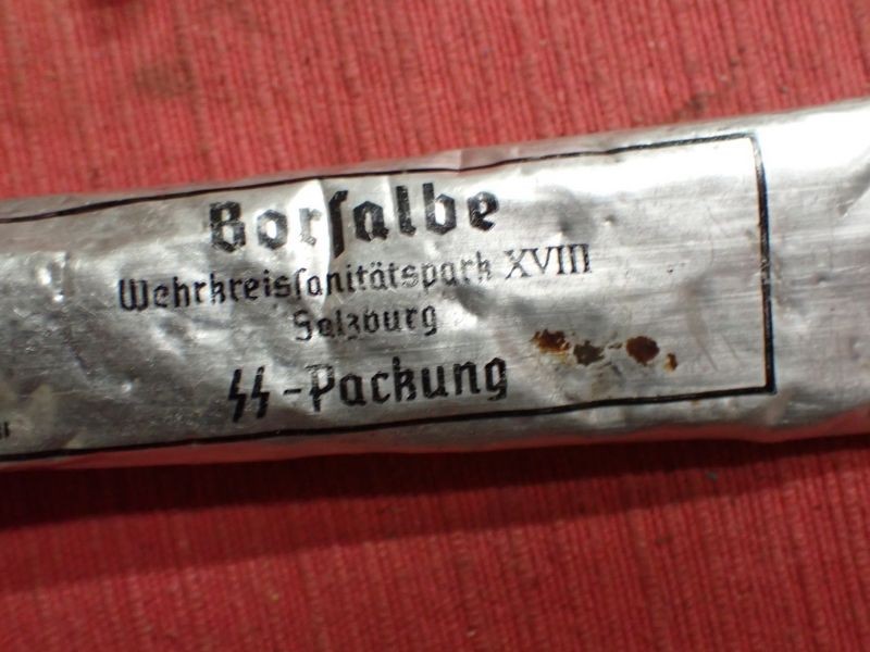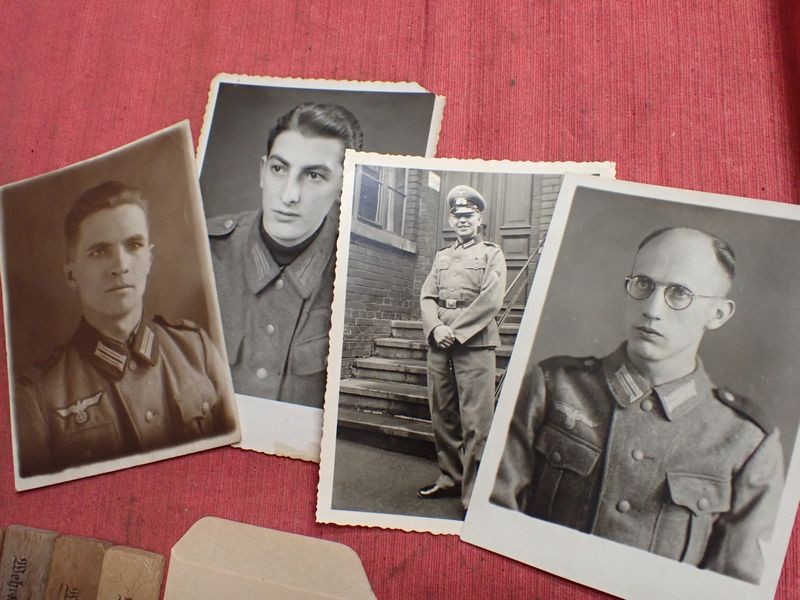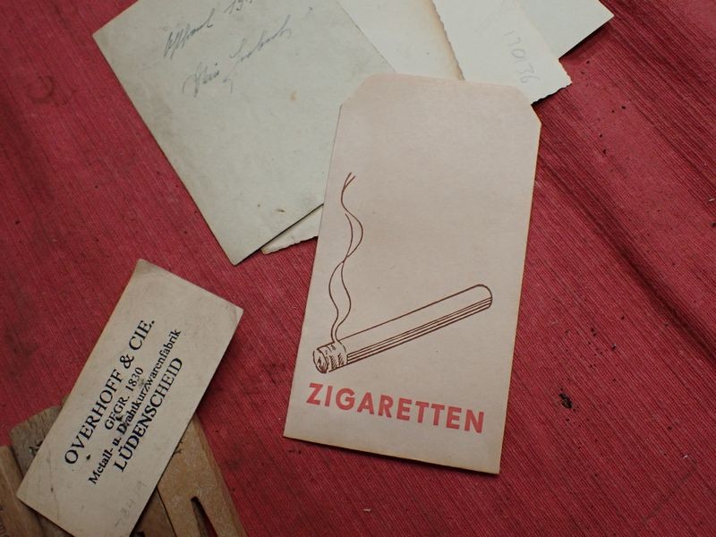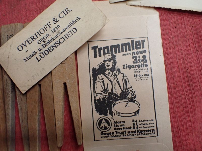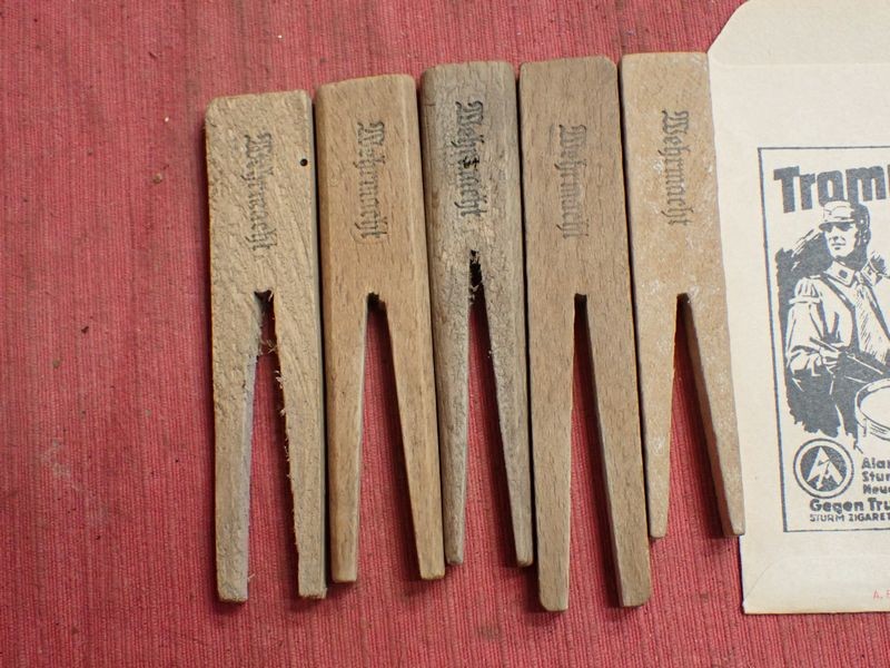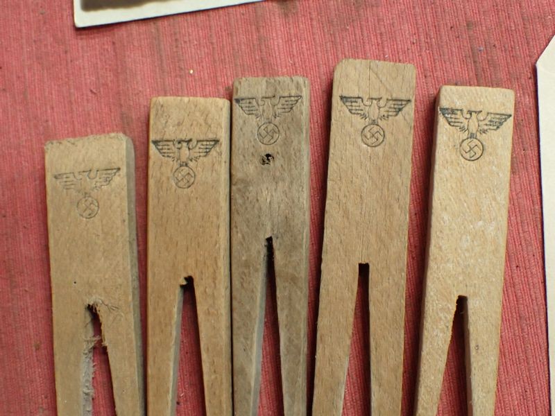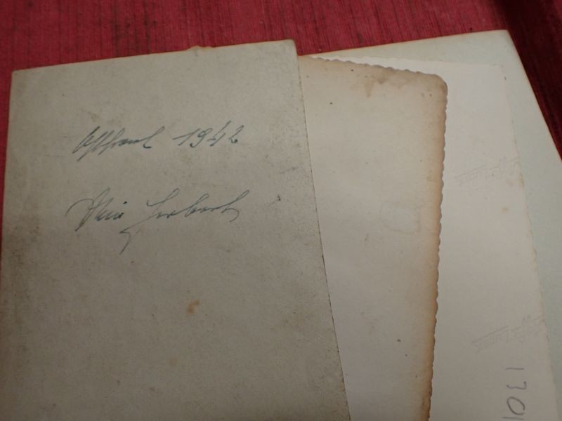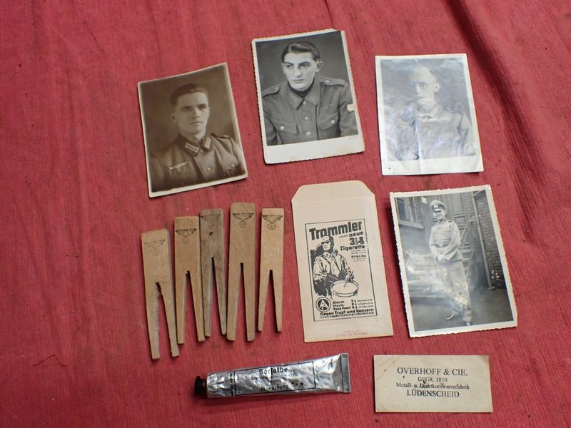 Four photographs, one dated on the back. Five army-marked clothing pegs. A retailer's card for a stickpin. A packet for Trommler cigarettes and an SS-marked tube of salve, still with contents.