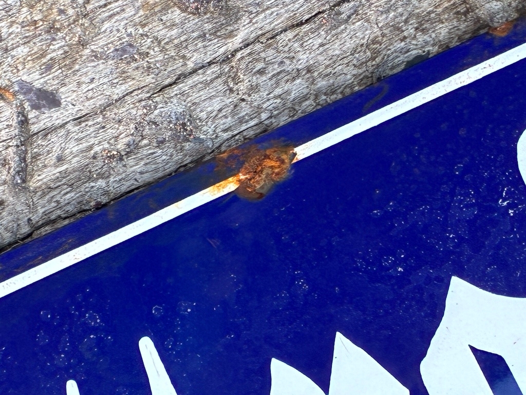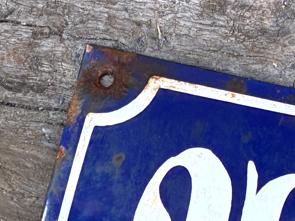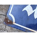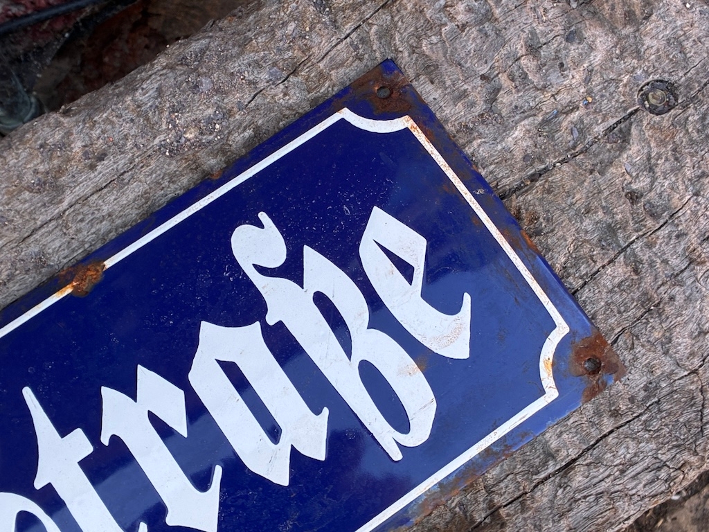 RARE FULL SIZE GERMAN STREET SIGN FOR ADOLF HITLER STRASSE. IN THE 1930'S MANY TOWNS AND GERMAN CITIES CHANGED STREET NAMES OVER IN DEDICATION TO THE SENIOR NAZI LEADERS. ENAMEL ON CONVEX STEEL, 800 BY 200 MM. IN VERY GOOD CONDITION WITH ONLY A FEW RANDOM CHIPS TO THE ENAMEL AND SCREW HOLES