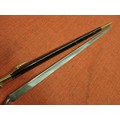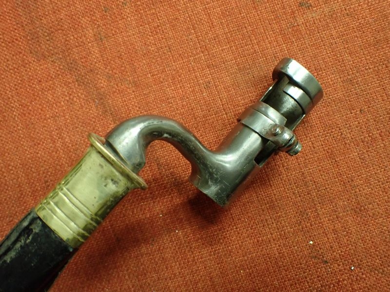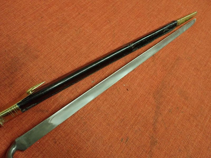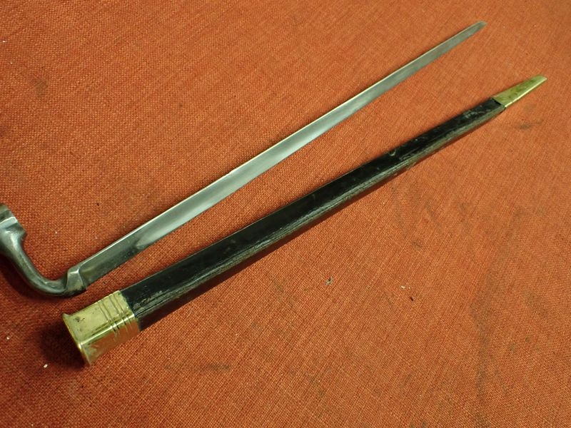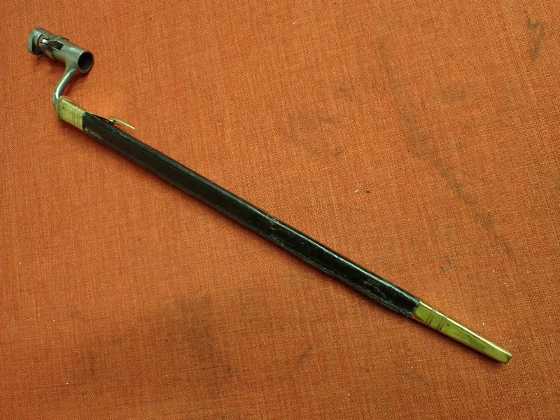 WELL MADE ACCURATE COPY FOR RE-ENACTMENT. BRASS MOUNTED LEATHER SCABBARD. 430 MM LONG TRI – FORM BLADE. SOCKET WITH AN M.R.D OF 20 MM FOR THE LARGE CALIBRE PERCUSSION MUSKETS OF THE TIME. LONG SHANK TO THE SOCKET