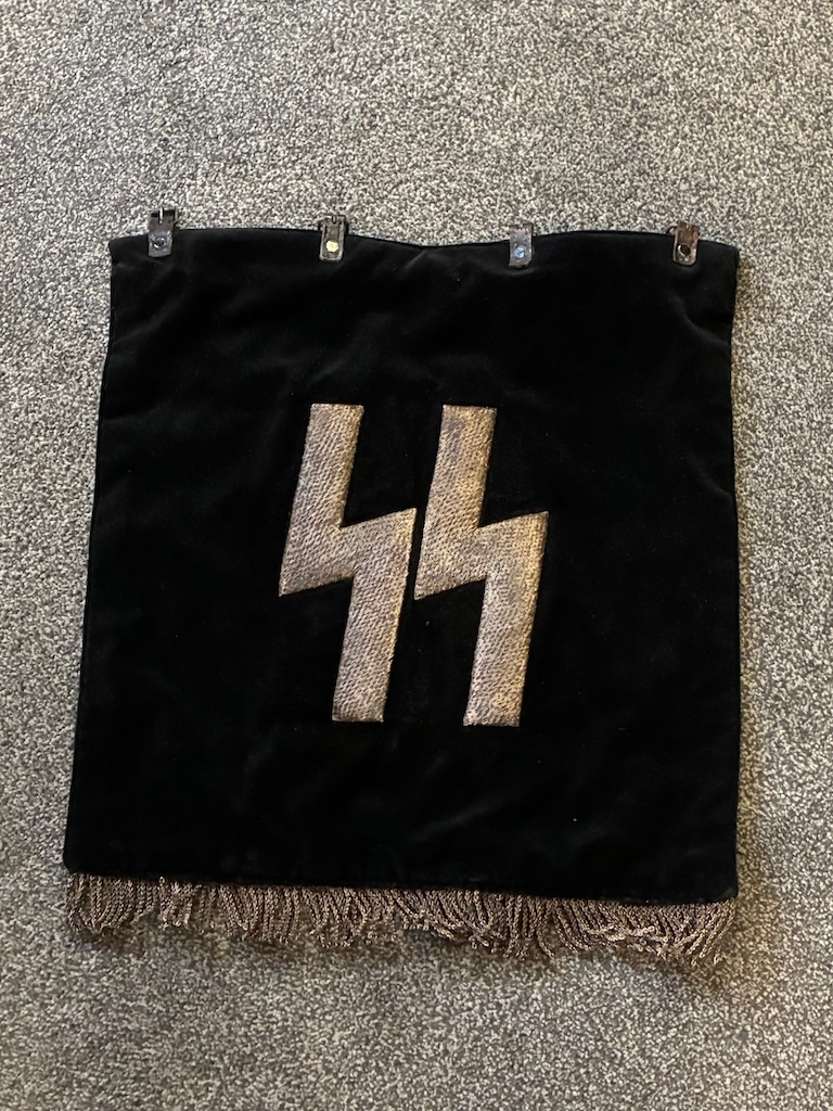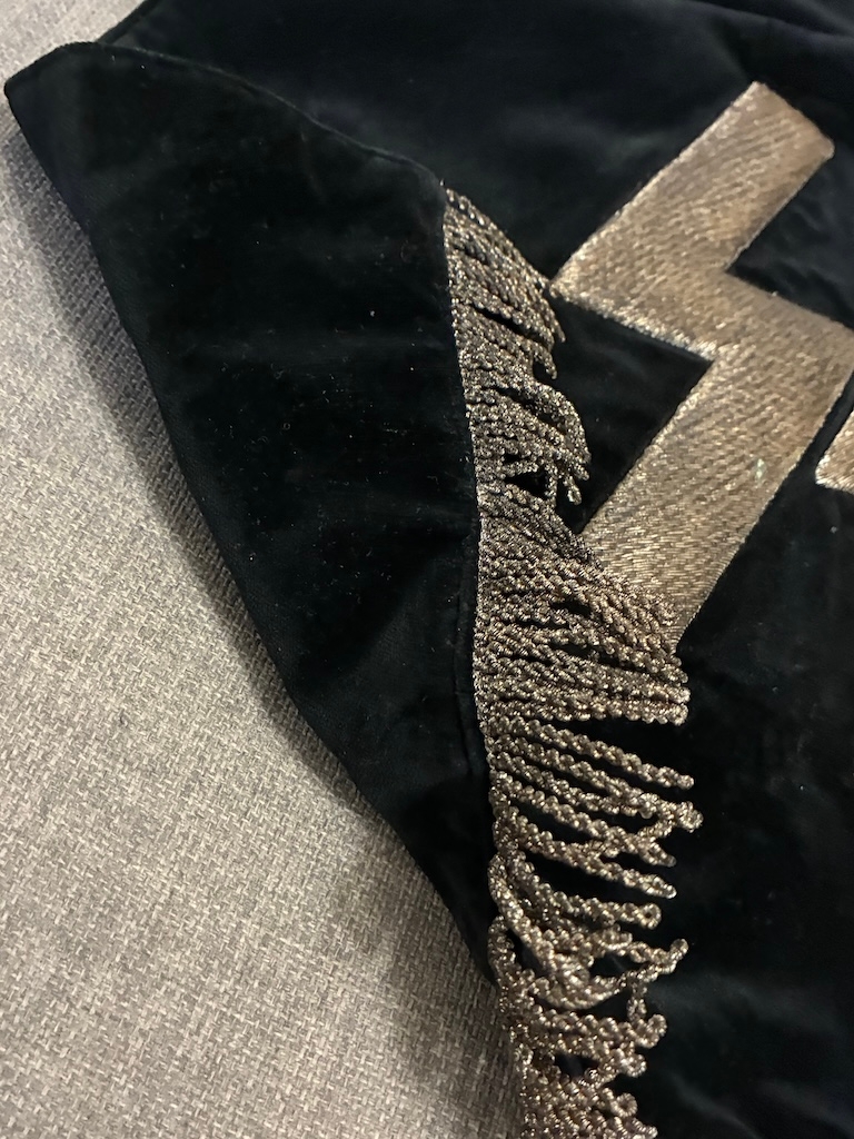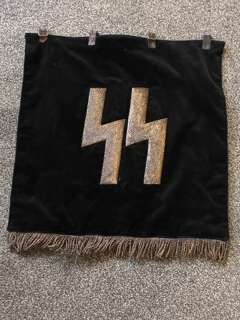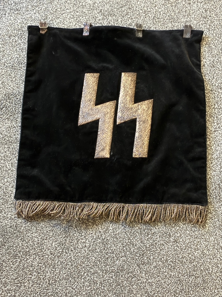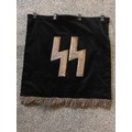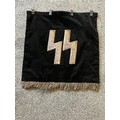 An early Kampfzeit (years of struggle pre 1933) SS Trumpet Banner , velvet material with metallic runes to both sides and a metallic silver tassle. Measures 45 x 45 cm excluding the tassles. Excellent condition.