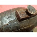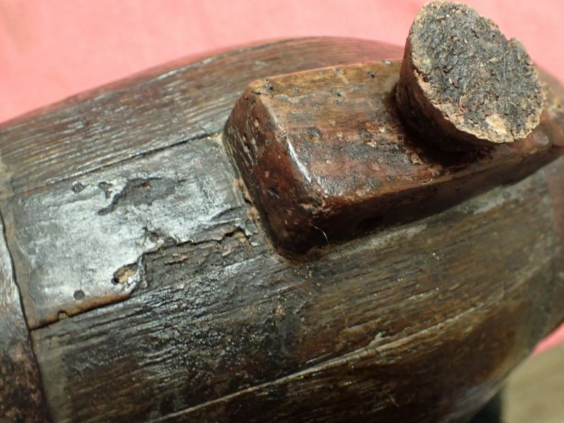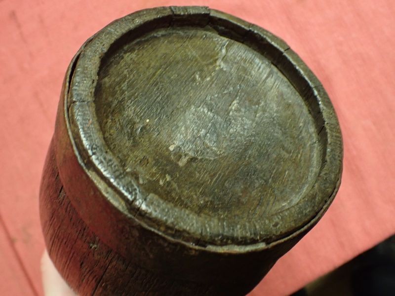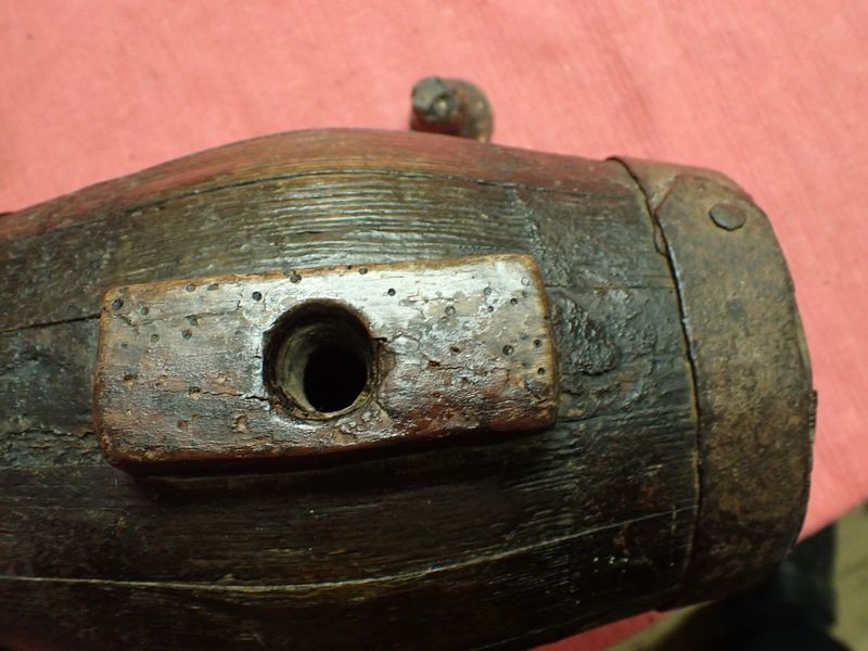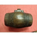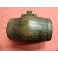 Small powder keg. Very nice patina to the wood. Two hammered iron bands (two missing). opening mount with cork bung, and two holes for suspension. 202 mm across.