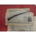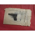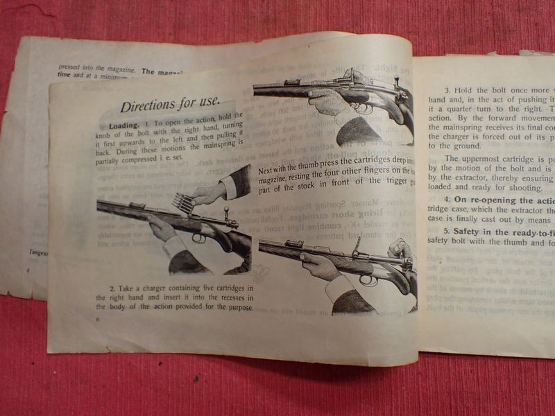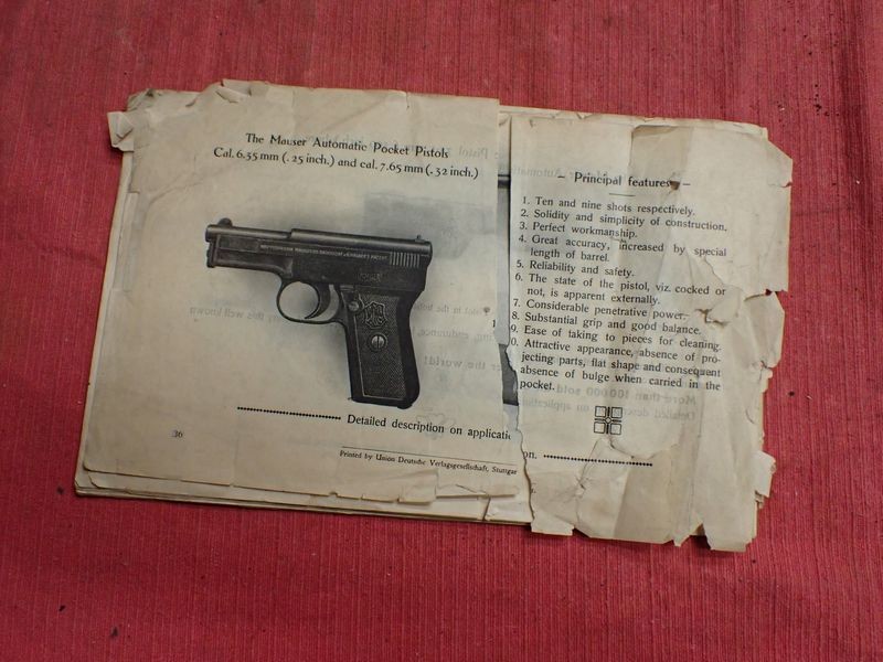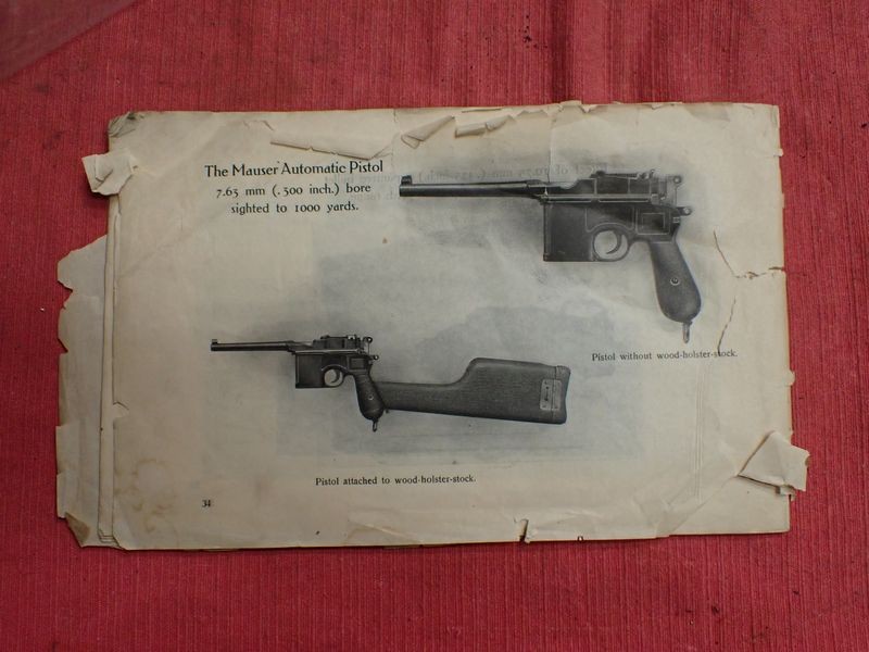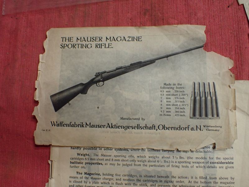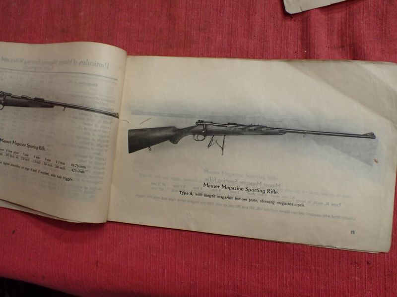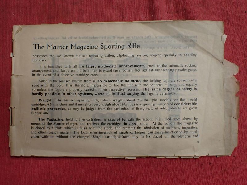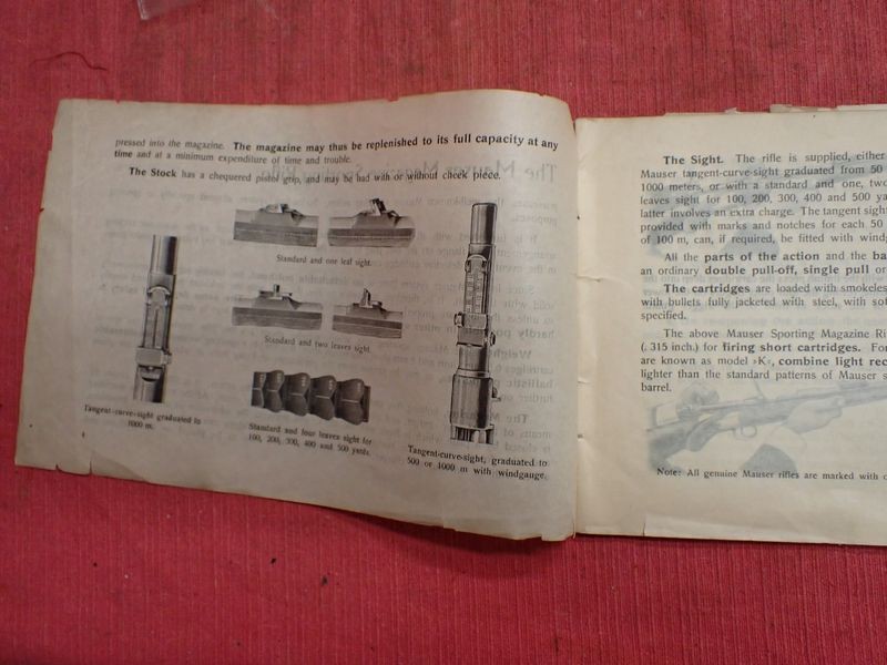 Rare early manual for the Mauser sporting rifle. Also advertises the C96 and M-1914. 9 by 5.75 inches. The front and back covers are detached and ripped as shown.